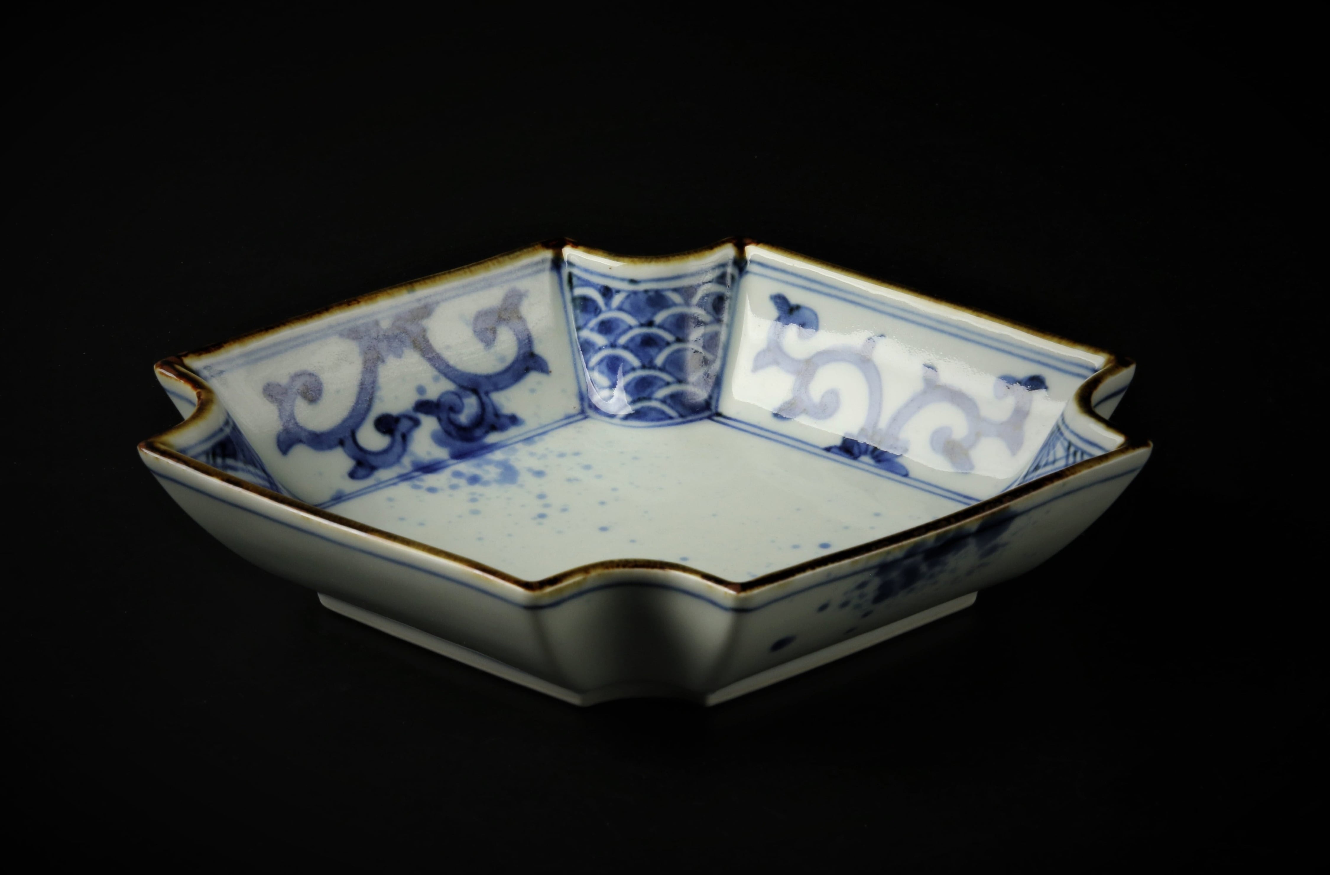 歪みのある長角の糸巻型の向付。盛り付けの色を選ばない染付のうつわです。