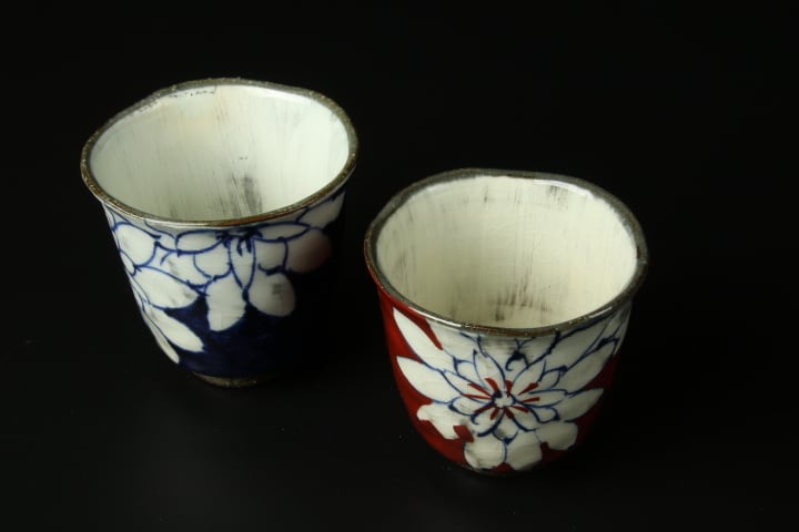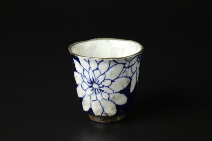 風合いのある生地に白いダリアの絵を施した湯呑。表面がいびつにしてあるのは、滑りづらく手になじみ持ちやすくするためです。