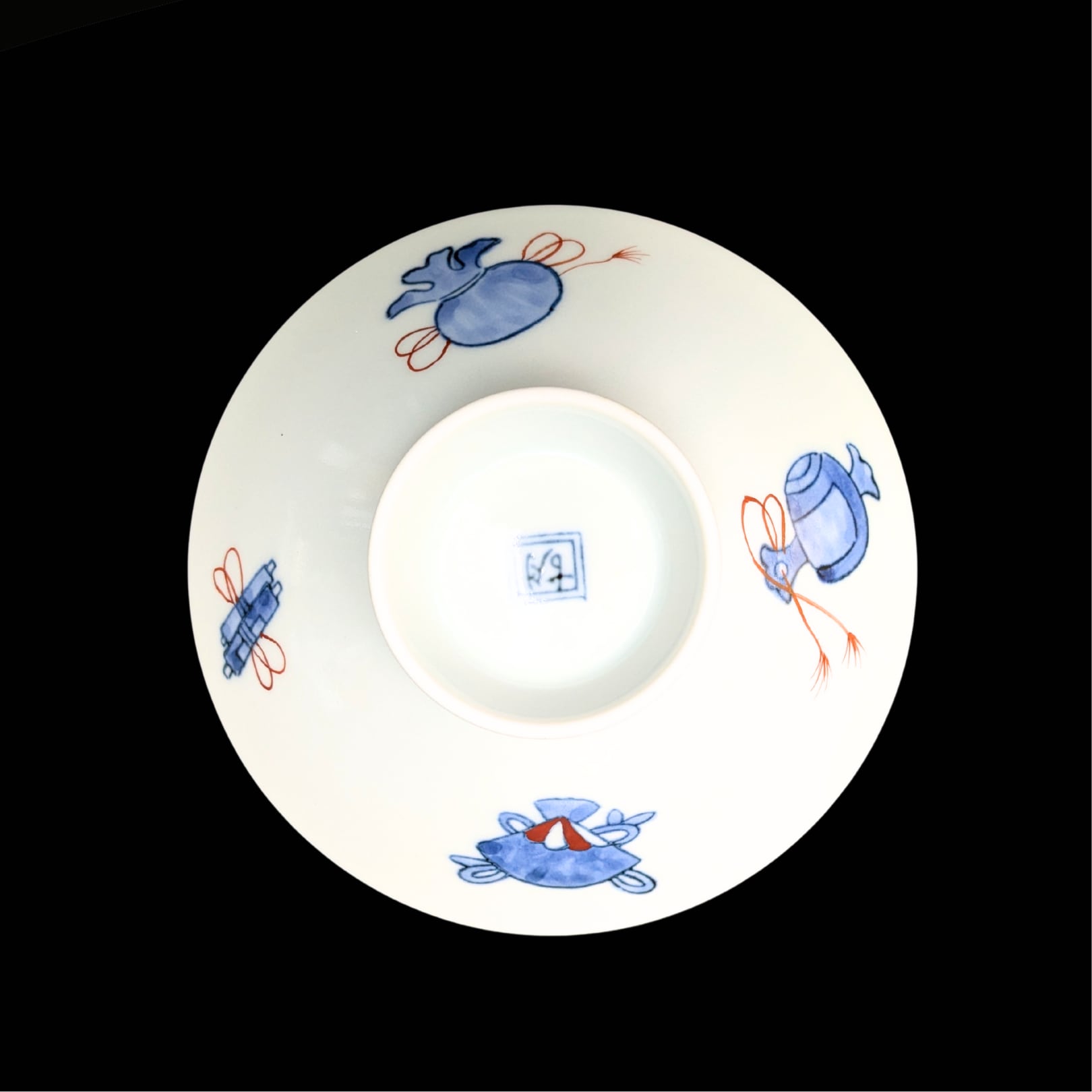 口が広く平たい、バランスと佇まいが美しいご飯茶碗です。藍染付と朱で品の良い錦絵が描かれています。