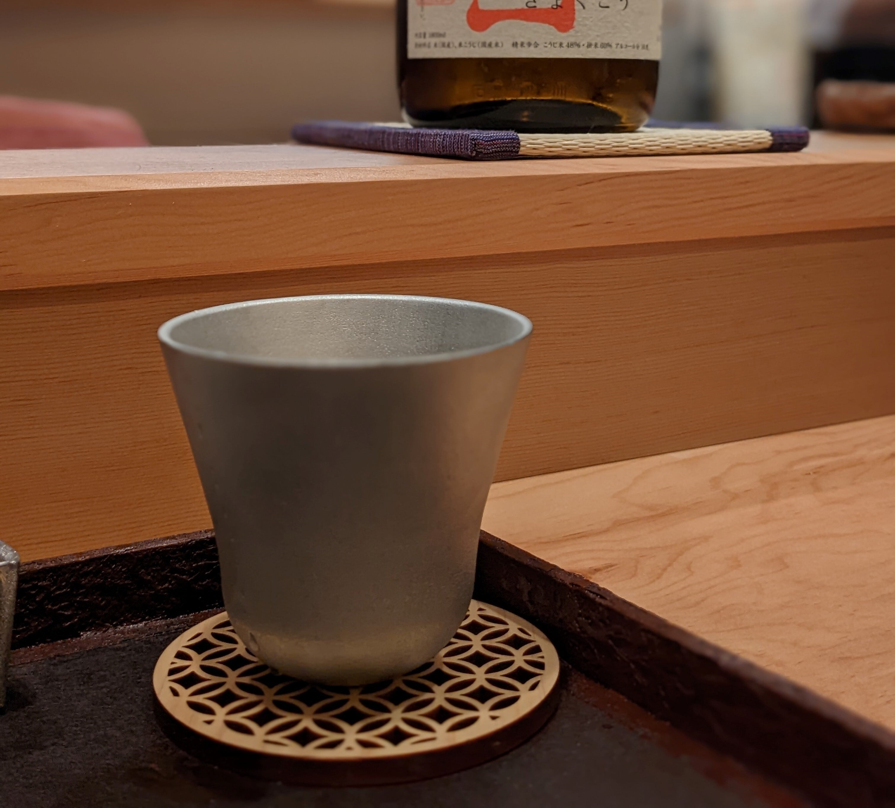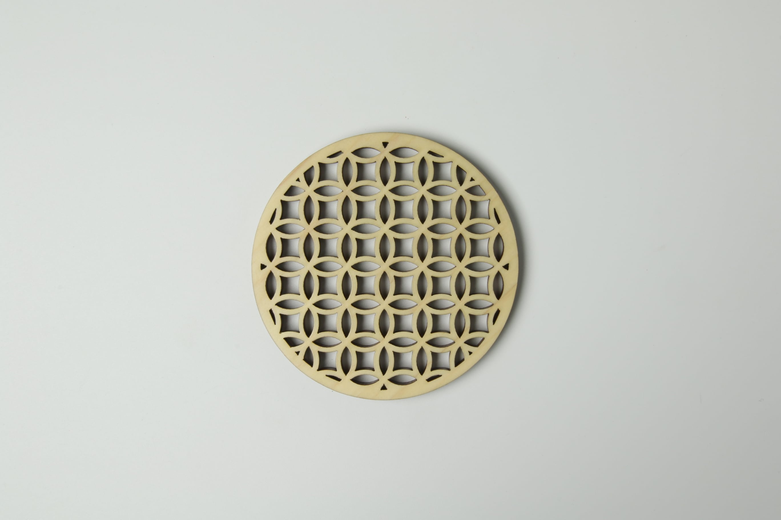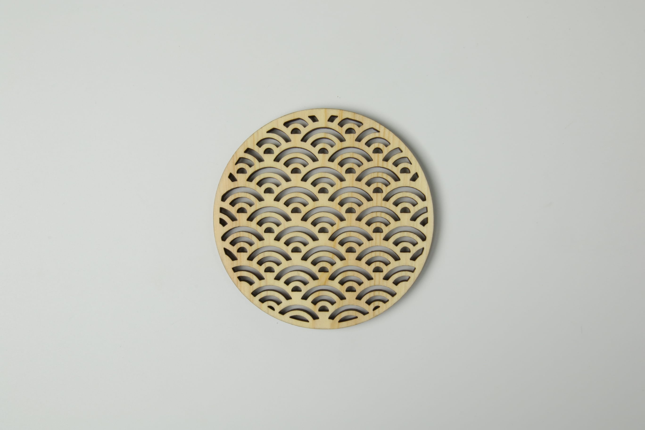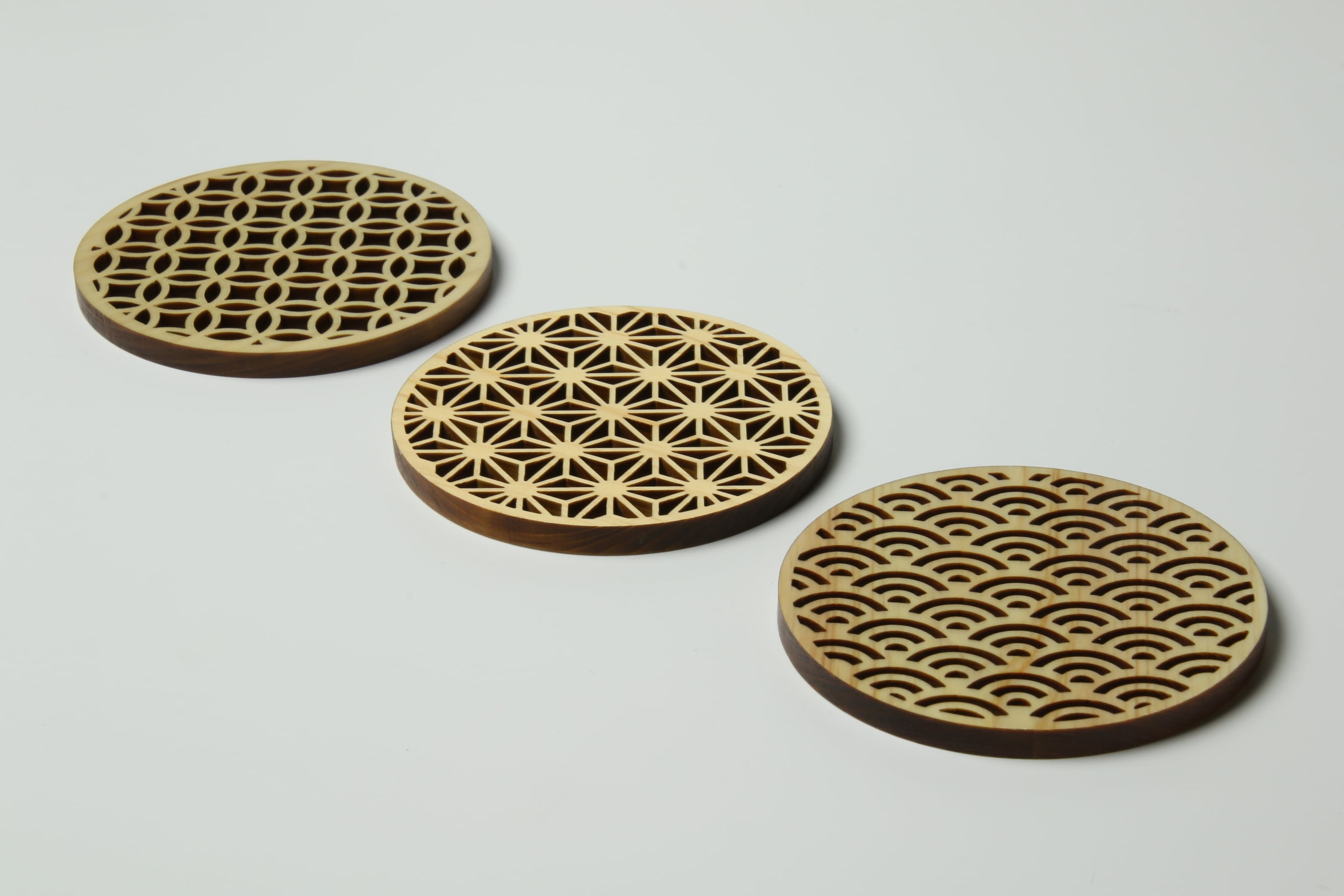 ほんのり香り漂うひのきのコースターです。レーザー加工により細密な透かし加工が施されています。日本伝統模様の青海波、麻の葉、七宝の3柄。コースターとしてはもちろん、お茶托としても相性の良いデザインです。